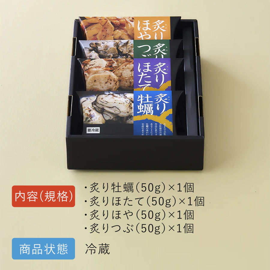 ・炙り牡蠣(50g)×1個 ・炙りほたて(50g)×1個 ・炙りほや(50g)×1個 ・炙りつぶ(50g)×1個