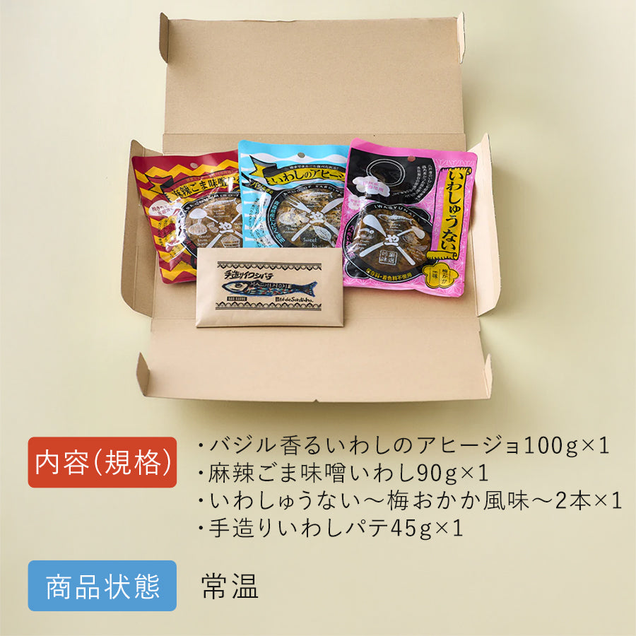 ・バジル香るいわしのアヒージョ100g×1 ・麻辣ごま味噌いわし90g×1 ・いわしゅうない~梅おかか風味~2本×1 ・手造りいわしパテ45g×1