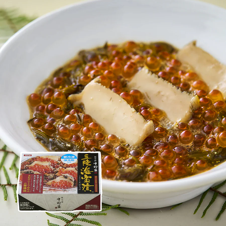 めかぶは三陸の海そのもの、いくらは朝日に照らされキラキラと輝く水面、あわびは水面に浮かぶ小舟…そんな三陸海岸の風景を一つの器の中に表現したのが、三陸海宝漬です。元々、中村家の原点は釜石の海鮮料理店で、三陸海宝漬はその頃のメニューでしたが、持ち帰って家族にも食べさせてあげたい、贈答品として大切な方に送りたい、というお客様の声をいただくようになり、商品化に至りました。